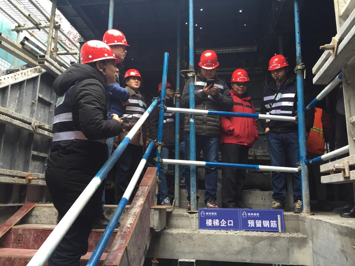 觀摩現場共設PC裝配式預制樓梯現場預制展示區、樓層預埋位置展示區、標準化展示區、安全體驗區、綠色施工展示區、各工序穿插施工等部分以及碧桂園新體系、新工藝展示鋼爬架、鋁模、精地坪、樓層止水、粉刷石膏抹灰、穿插施工等充分展示了項目的管理和技術亮點。此外,項目還將視頻影像、現場演示等手段相結合,對樓梯現場預制進行集中展示,贏得了領導們的贊譽。