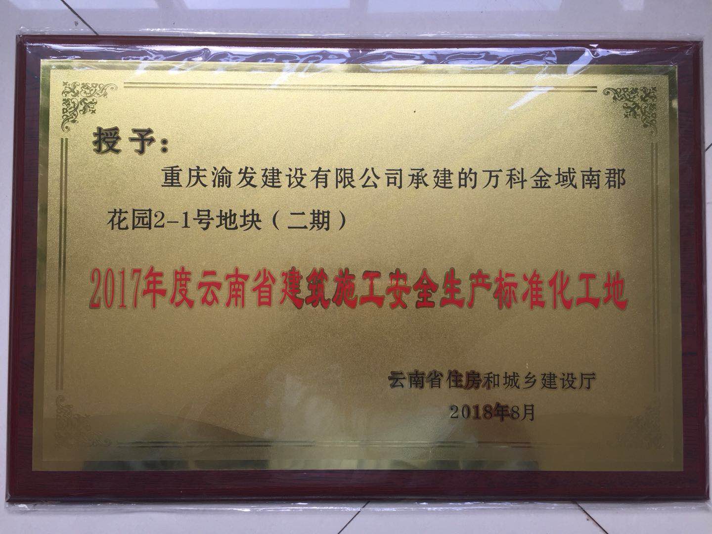 我司承建的昆明萬科金域南郡花園2-1號地塊(二期)工程、昆明萬科金域南郡花園3號地塊二標段三期工程榮獲“云南省建筑施工安全生產標準化工地”稱號。